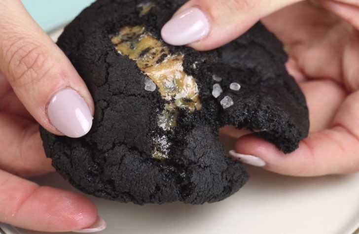 Form cookie balls in your hands, then break open, placing an unwrapped caramel into the centre then resealing the edges, and re-rolling to give it back it's round shape. Top with a pinch of sea salt, and place on a parchment paper lined baking sheet.